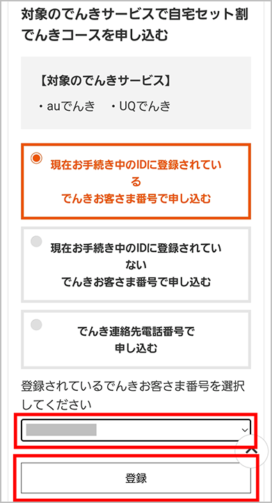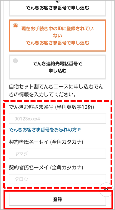 【お手続き中のIDに登録されているでんきお客さま番号で申し込む場合】