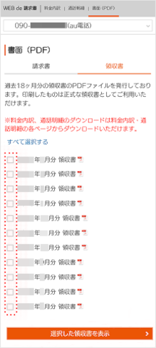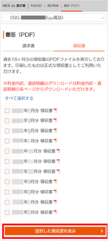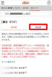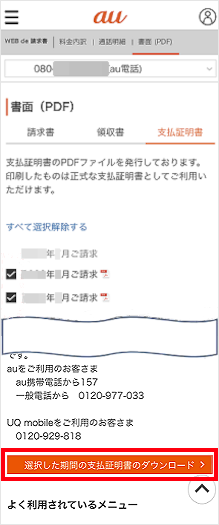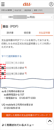 支払い方法が口座振替の場合にのみ、過去18カ月分の領収書をMy UQ mobile(Web)の「WEB de 請求書」からPDF形式でダウンロードできます。