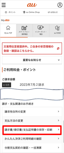 [請求書/領収書/支払証明書の保存・印刷]をタップします。