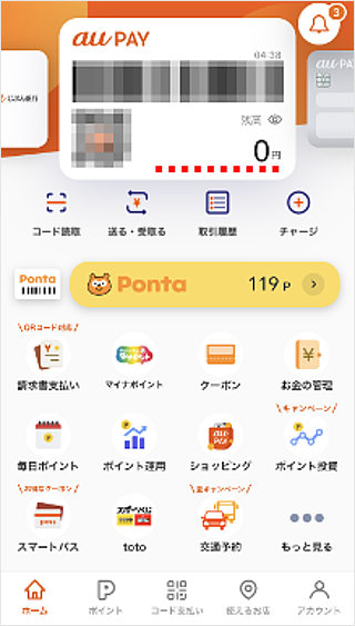 ※残高が「---円」と表示されている場合は、残高が非表示になっています。「---円」と表示されている箇所をタップすると、残高が表示されます。