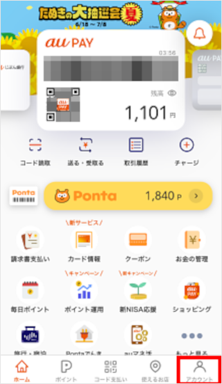 au PAY アプリの画面下の「アカウント」で確認できます。