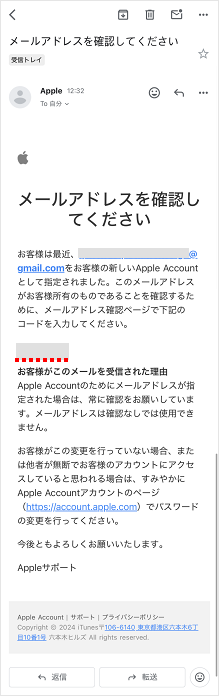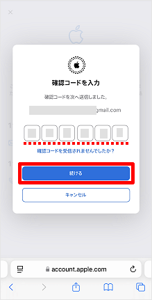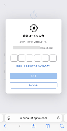 こちらの画面が表示されたら、変更先のApple Accountのメールアドレス宛に確認コードが送信されます。