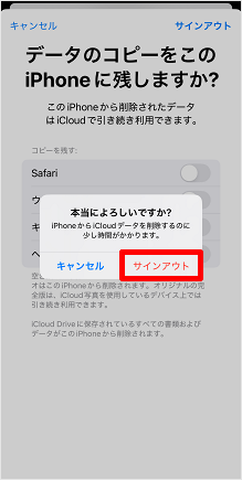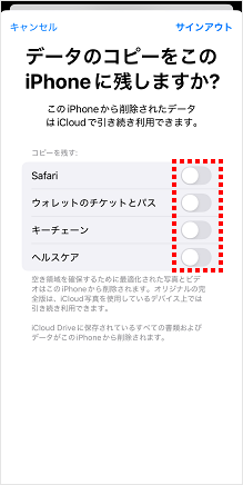 コピーを残す項目をタップしてオンにし、[サインアウト]をタップします。