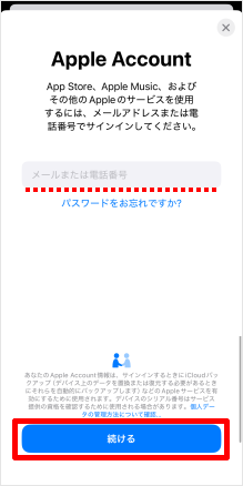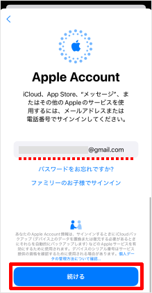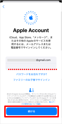 変更後の Apple Account を入力し、[続ける]をタップします。
