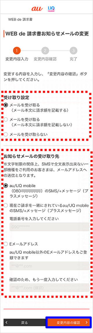 「受け取り設定」「お知らせメールの受け取り先」を選択し、[変更内容の確認]をタップします。