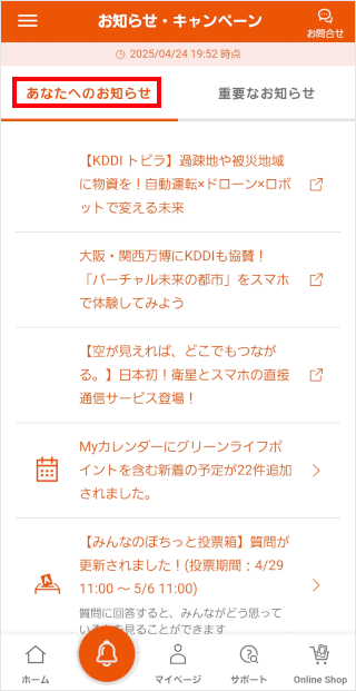 [あなたへのお知らせ]をタップすると、お知らせが表示されます。