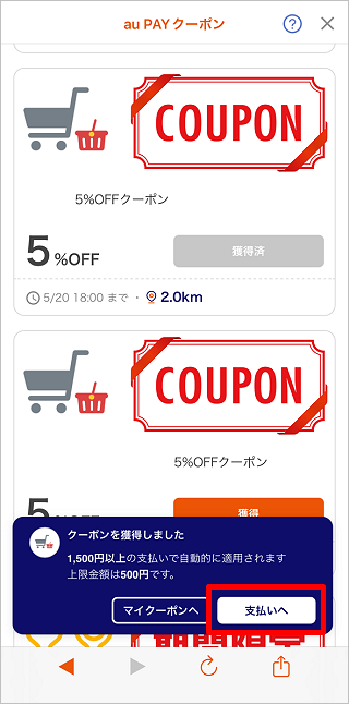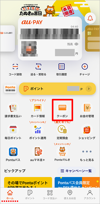 au PAY アプリの「ホーム」にある「クーポン」から使いたいクーポンを設定できます。