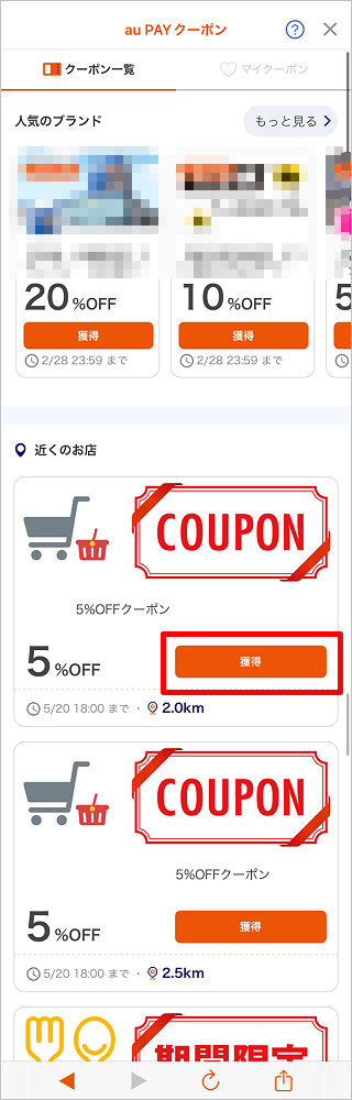 使用するクーポンを選択し、[獲得]をタップします。