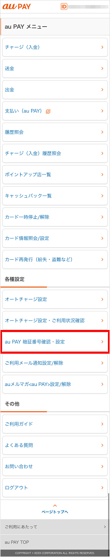 「各種設定」項目の[au PAY 暗証番号確認・設定]をタップします。