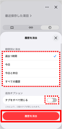 削除したい期間を選択し、[履歴を消去]をタップします。