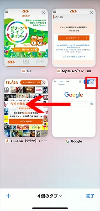 表示されたタブ一覧で不要なタブの[×]をタップするか、タブを矢印の方向へスライドするとタブを閉じることができます。