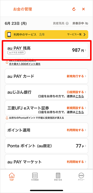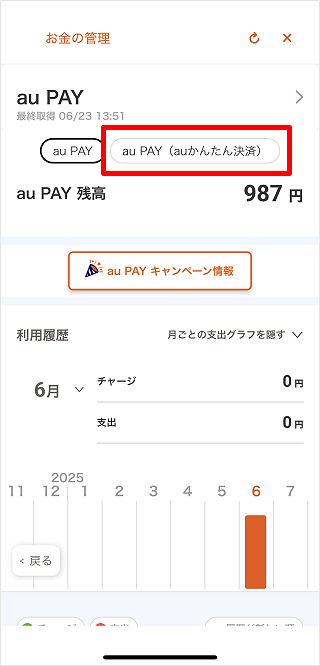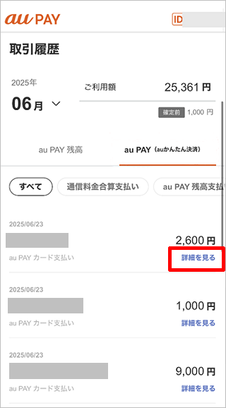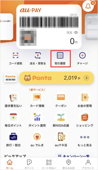 au PAY(auかんたん決済)の利用履歴は、「au PAY アプリ」の取引履歴画面で確認できます。