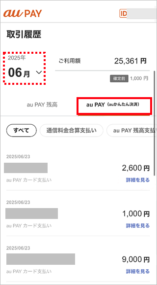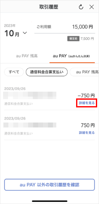 6カ月以上前の利用明細は、au PAY アプリの取引履歴画面で確認できます。