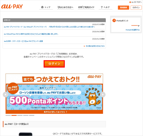 「au PAY サイト」にアクセスし、au IDとパスワードでログインします。