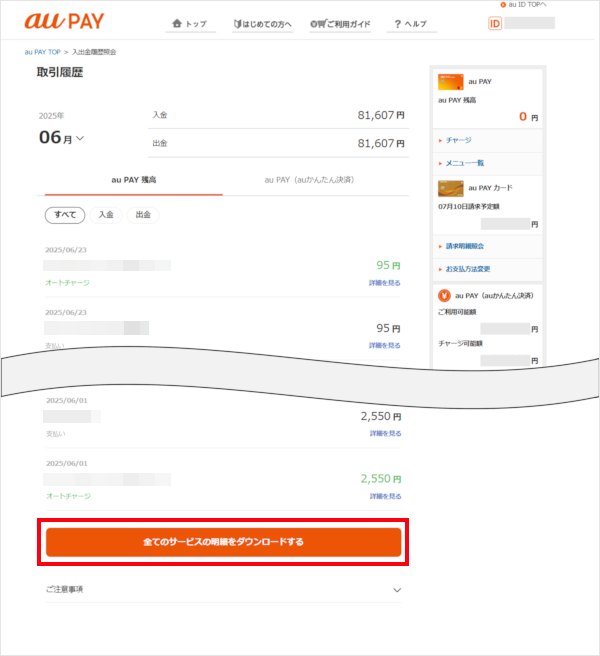 au PAYサイトの履歴照会ページにパソコンでアクセスするとダウンロードできます。