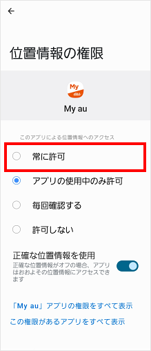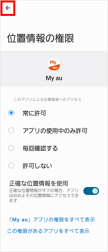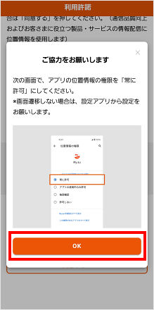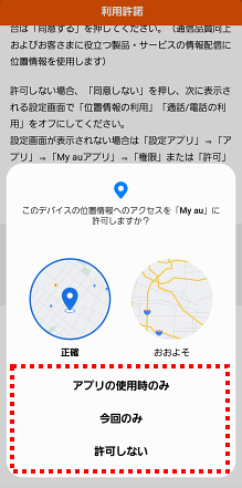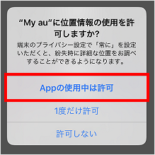 位置情報許可ダイアログ[アプリの使用時のみ][今回のみ][許可しない]のいずれかをタップします。