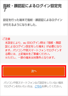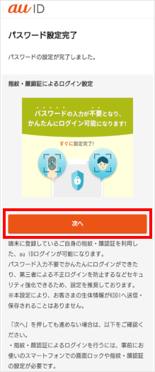 ※画面が進まない場合は生体認証(指紋・顔)などが未設定の可能性があります。生体認証(指紋・顔)または番号認証/パターン認証などの画面ロック登録をしていただくことで次の画面へ進みます。