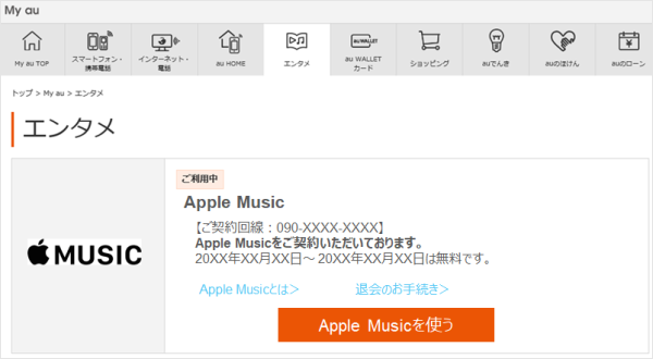 無料期間はMy UQ mobile(Web)内、エンタメの「Apple Music」欄でご確認いただけます。