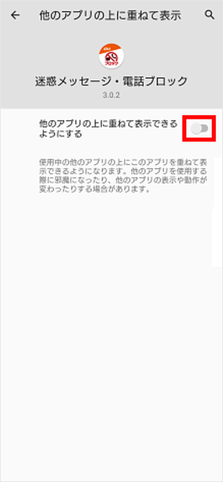 [他のアプリの上に重ねて表示できるようにする]のスイッチをタップしてオンにします。