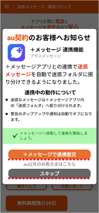 +メッセージと連携したいお客さまは[+メッセージで連携設定]を、それ以外のお客さまは[スキップ]をタップします。