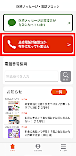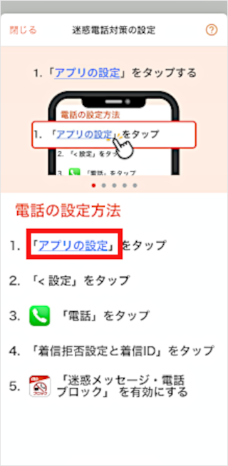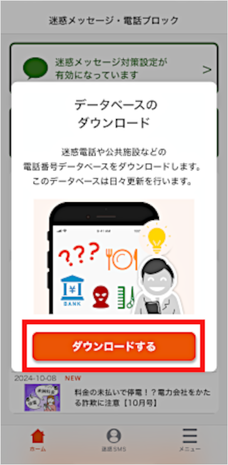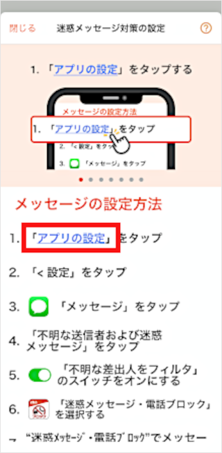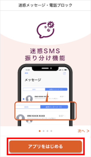 「迷惑メッセージ・電話ブロックアプリ」をダウンロード後に初期設定することで利用できます。