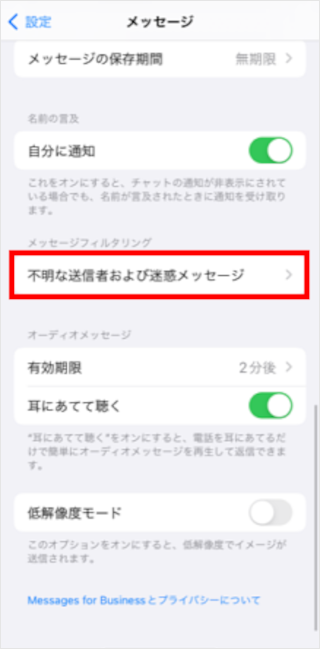 [不明な送信者および迷惑メッセージ]をタップします。