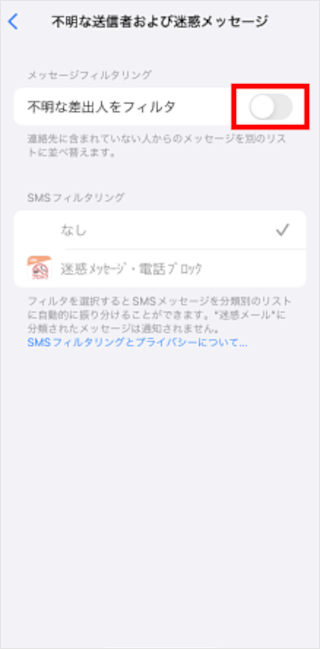 [不明な差出人をフィルタ]のスイッチをタップしてオンにします。