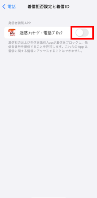 [迷惑メッセージ・電話ブロック]のスイッチをタップしてオンにします。