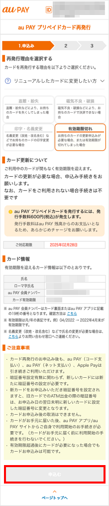 お持ちのau PAY プリペイドカード(プラスチックカード)を有効期限後もご利用希望の場合は、au PAY プリペイドカード再発行ページでお申し込みください。
