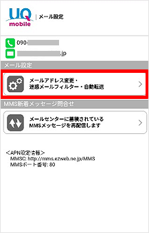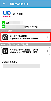 [メールアドレス変更・迷惑メールフィルター・自動転送]をタップします。