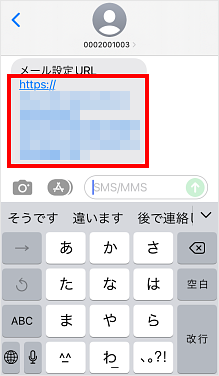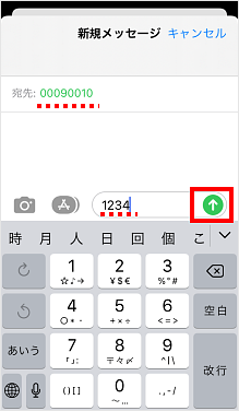 宛先に設定画面用特番「00090010」、メッセージに「1234」を入力して[送信ボタン]をタップします。