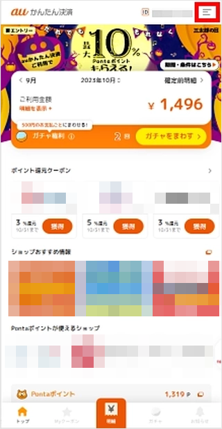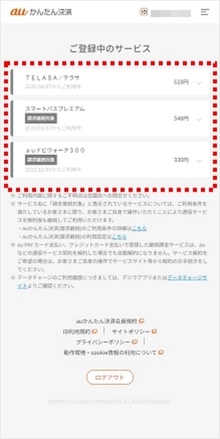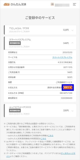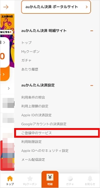 「auかんたん決済設定」の[ご登録中のサービス]をタップします。