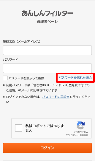 管理者パスワードをお忘れの場合は、管理者ページの「パスワードを忘れた場合」でパスワード再発行ができます。