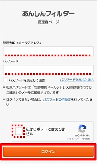 「管理者ID(メールアドレス)」と「パスワード」を入力し、「私はロボットではありません」にチェックをして[ログイン]をタップします。