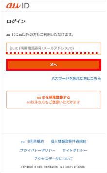 「au ID+_(半角アンダーバー)」+「解約/譲渡/承継の年月日(西暦8桁)」のau IDを入力して、[次へ]をタップします。