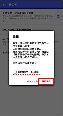 「端末内のデータも削除」のチェックを外して、[実行する]をタップします。