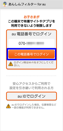 ※機種変更時など、元の端末で使用していた安心アクセスの設定を引き続き利用する場合は[au IDでログイン]をタップします。その後、手順⑩に進みます。