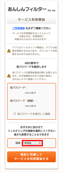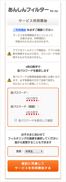 お子さまの端末で「あんしんフィルター for au アプリ」をインストールし、サービスの利用登録を行います。