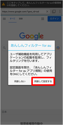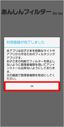 お子さまの端末の「あんしんフィルター for au アプリ」で、管理者登録を行います。
