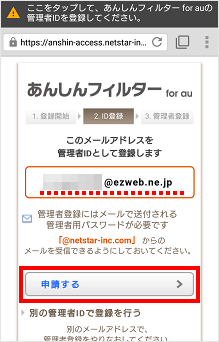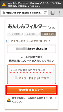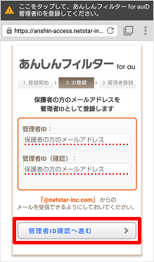 [ここをタップして、あんしんフィルター for auの管理者IDを登録してください。]をタップします。