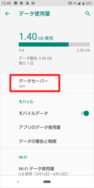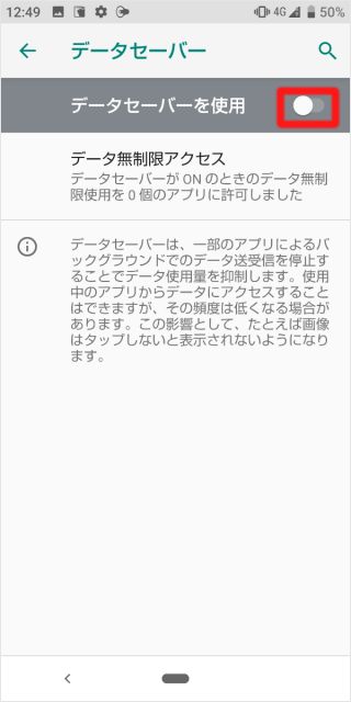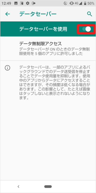 「データセーバーを使用」のスイッチがオンになりましたら、操作は完了です。