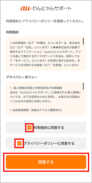 利用規約、プライバシーポリシーをご確認いただき、チェックボックスにチェックを入れます。