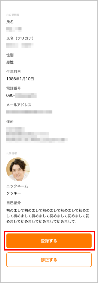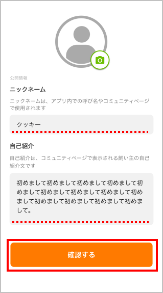 アイコン画像を設定し、ニックネーム・自己紹介を入力後、[確認する]をタップします。