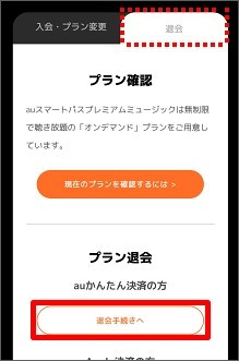 「各種サービス入会・退会」ページを開き、auスマートパスプレミアムミュージックの[退会]をタップします。