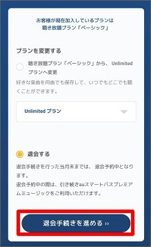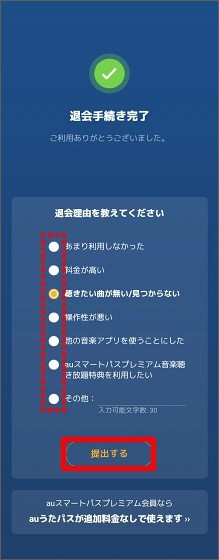 以上で、auスマートパスプレミアムミュージックの退会は完了です。