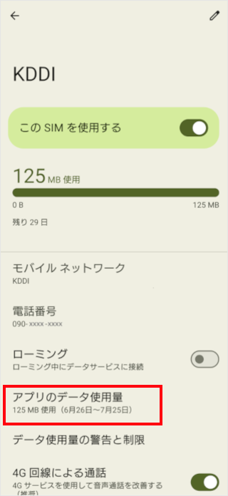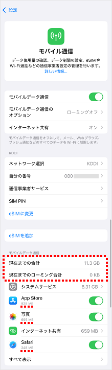 現在の累計のモバイルデータ通信量・ローミングデータ通信量・アプリごとのデータ通信量の目安を確認することができます。