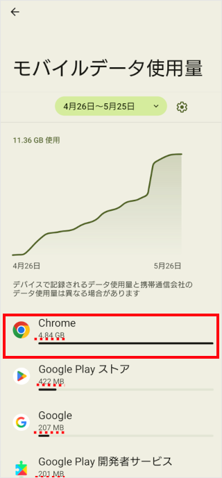 主に使用しているアプリが表示され、消費データ量を確認できます。