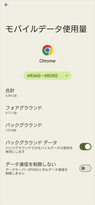 消費内容の詳細やバックグラウンドのデータ使用の変更などができます。