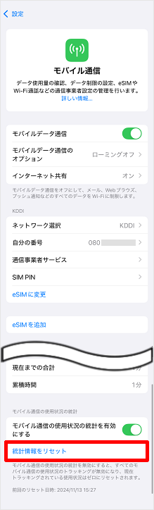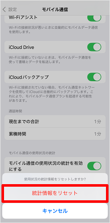 ※iPhone/iPadはデータ通信量のカウントが自動でリセットされません。数カ月分のデータ通信量の合計が表示されており、直近でどのアプリが大量のデータを消費したのか分からない場合は、次の手順の「統計情報のリセット」を行い、こまめにデータ通信状況をご確認いただくことをおすすめします。