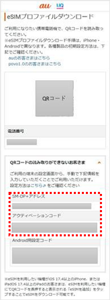 eSIMプロファイルの手動設定に必要な「SM-DP+アドレス」と「アクティベーションコード」が表示されます。